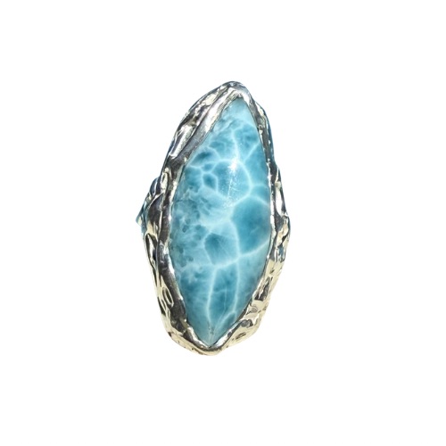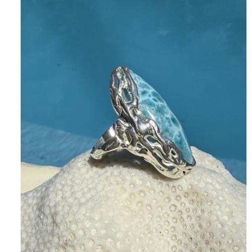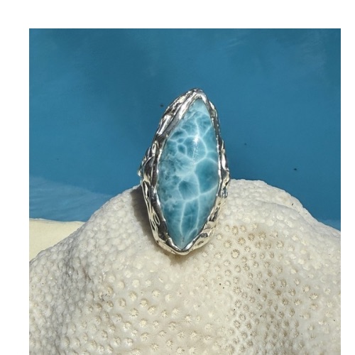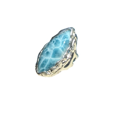 Ein außergewöhnlicher Statement-Ring von erlesener Raffinesse: Im Zentrum steht ein AAA-Larimar von seltener Schönheit, dessen faszinierende Blaunuancen – durchzogen von feinen, wolkenartigen Weißadern – an das lebendige Spiel von Himmel, Ozean und schäumender Gischt erinnern. Ein echtes Naturwunder, eingefangen in seiner edelsten Form. Die Silberfassung ist ein Meisterwerk für sich: kunstvoll von Hand gearbeitet, mit einer ganz besonderen, individuell gestalteten Einfassung, die antike Anmutung und moderne Eleganz auf höchstem Niveau vereint. Jedes Detail zeugt von handwerklicher Präzision und künstlerischem Anspruch – der Stein wird nicht nur gehalten, sondern inszeniert. Die offen gearbeitete Rückseite unterstreicht die Exklusivität dieses Schmuckstücks und ermöglicht es dem Larimar, seine volle Ausstrahlung zu entfalten. Ihm wird nachgesagt, Balance, innere Ruhe und neue Lebenskraft zu schenken – eine spürbare Verbindung von Ästhetik und Energie. Dieser Ring ist kein Accessoire. Er ist ein Ausdruck von Stil, Tiefe und Individualität – ein Schmuckstück erster Klasse mit unverwechselbarer Aura. Absolut einzigartig.