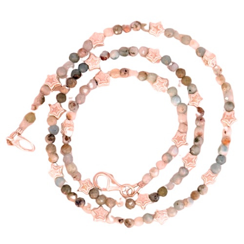 Facettierte Larimarart-Kügelchen 3mm Durchmesser, harmonisch aufgereiht und kombiniert mit Begleitmineralien in verschiedenen Farben wie Weiß, Blau, Rötlich und Sand. Highlight sind die kleinen Silbersterne zwischen den Kügelchen. Dieses vielseitigen und alltagstaugliche Schmuckstücke ist perfekt kombinierbar mit anderen facettierten Ketten und verleihen jedem Outfit einen eleganten, natürlichen Touch.