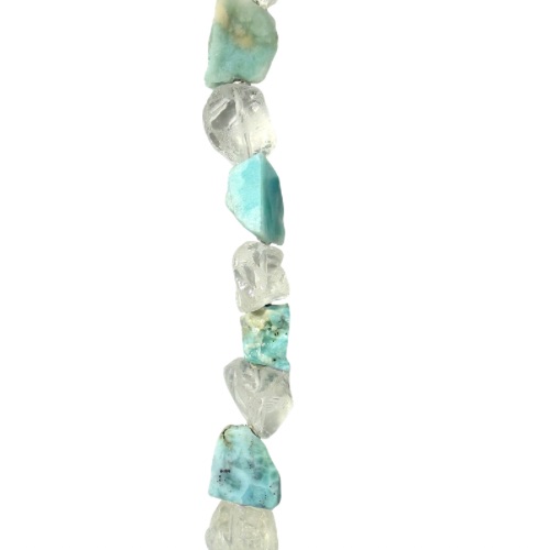 Die Larimar-Bergkristall-Kette Fiona besteht aus naturbelassen geschliffenen Larimarsteinen in unterschiedlichen, organischen Formen. Die bewusst grobe Verarbeitung unterstreicht den ursprünglichen Charakter der Steine. Jeder Larimar zeigt seine eigene Farbwelt – von leuchtendem Blau über weißliche und graue Töne bis hin zu zarten rötlichen Nuancen, die durch natürliche Begleitmineralien entstehen. Zwischen den Larimarsteinen sind klare Bergkristallsteine eingearbeitet, die Leichtigkeit und Transparenz in das Design bringen. Kleine silberne Zwischenteile verbinden die Elemente harmonisch und geben der Kette eine ruhige, elegante Struktur. In der Steinlehre steht Larimar für Gelassenheit, emotionale Balance und sanfte Selbstentfaltung, während Bergkristall Klarheit und innere Ausrichtung unterstützt. Gemeinsam entsteht eine Kette mit einer ruhigen, ausgleichenden Ausstrahlung.