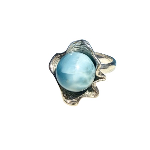 Ein Schmuckstück wie aus einem Traum: Der Ring Flora vereint kunstvolle Gestaltung mit der natürlichen Schönheit des Larimars. Die runde, von Weiß durchzogene Larimarkugel in kräftigem Himmelblau bildet den harmonischen Blütenstempel – eingefasst in edles Silber, das sich in unregelmäßigen, organisch geformten Blütenblättern um den Stein legt. Jedes Detail dieses Rings strahlt Extravaganz und Individualität aus. Die asymmetrische Blütenform verleiht Flora eine lebendige, fast schon skulpturale Ästhetik – ein Blickfang für alle, die das Besondere lieben.