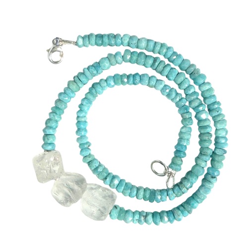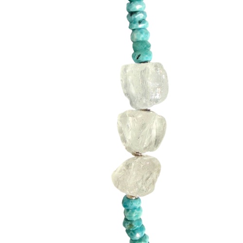 Diese Larimar-Bergkristall-Kette erzählt von Meer, Licht und innerer Klarheit. Das klare, sanfte Meeresblau des Larimars erinnert an tropische Gewässer und weite Horizonte. Jeder Stein schimmert lebendig und trägt seine eigene, natürliche Zeichnung – wie vom Wasser geformt. Seitlich eingearbeitet sind drei Bergkristallsteine, die durchsichtig und lichtvoll funkeln. Sie setzen einen raffinierten, ungewöhnlichen Akzent und lassen die Kette fast schwebend wirken. Ihr klares Leuchten verbindet sich harmonisch mit dem Blau des Larimars und verleiht dem Schmuckstück Tiefe und Eleganz. Symbolisch steht diese Kombination für die Vereinigung von Ruhe und Klarheit – das Blau des Meeres trifft auf das reine Licht des Kristalls. Die Kette wirkt edel, elegant und zugleich auffällig, ohne aufdringlich zu sein. Ein Schmuckstück für eine besondere Person, die Individualität liebt, Natürlichkeit schätzt und eine leise, aber starke Ausstrahlung trägt.