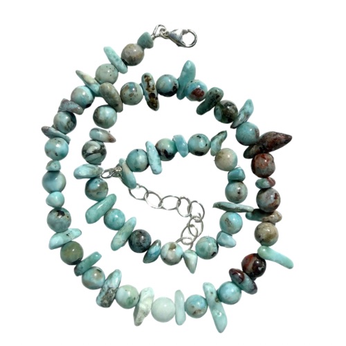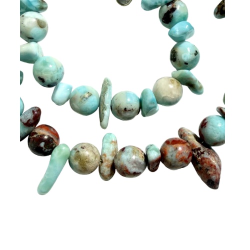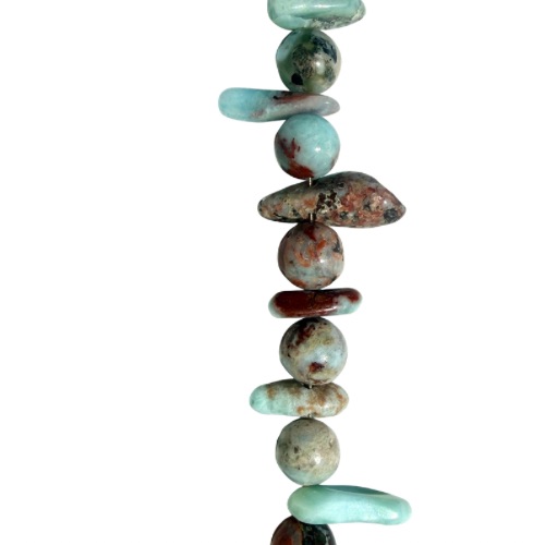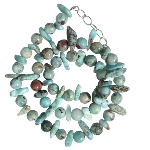 Diese Kette wird von seinen typischen Blautönen durchzogen, und trägt die Farben von Meer, Himmel und Licht in sich . Die natürlichen Begleitmineralien in rötlichen, braunen, rostfarbenen und grauen Nuancen erinnern an Erde, Fels und ursprüngliche Natur. In der Kombination von abwechselnd gearbeiteten Kugeln und Splittern entsteht ein lebendiges, organisches Gesamtbild, das die Ursprünglichkeit dieses besonderen Steins unterstreicht.
