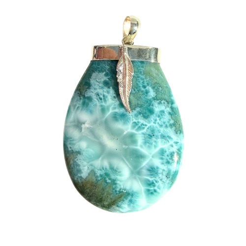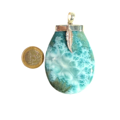 Dieser große, ovale Larimar-Anhänger ist ein wahrhaft wuchtiges Unikat. Sein außergewöhnlich schöner Farbverlauf reicht von unterschiedlichen Blautönen über Türkis bis hin zu weißlichen und zart grünlichen Nuancen. Beim Betrachten entsteht das Gefühl, als würde Meeresgischt kleine Inseln umspülen – lebendig, frei und voller Bewegung. Der Anhänger vermittelt ein starkes Gefühl von Freiheit, Weite und Verbundenheit mit dem Meer. Er steht für Power, Energie und Selbstvertrauen und wirkt zugleich beruhigend und stärkend. Die Silberfassung ist bewusst sehr reduziert gehalten, um dem Larimar seine volle Wirkung zu lassen. Eine feine, kleine Silberfeder schmiegt sich sanft an den Stein – ein symbolisches Detail, das für Leichtigkeit, Schutz und inneres Frei-Sein steht. Sie erinnert daran, alte Lasten loszulassen, dem eigenen Weg zu vertrauen und sich vom Leben tragen zu lassen. Gemeinsam verbinden Larimar und Feder die Tiefe des Meeres mit der Leichtigkeit der Luft – eine kraftvolle Kombination für innere Stärke, Freiheit und Harmonie. Die Rückseite des Anhängers ist offen gearbeitet, sodass sich die Energie des Steins ungehindert entfalten kann. Ein ausdrucksstarkes Schmuckstück für Menschen, die das besondere lieben und ihre innere Stärke sichtbar tragen möchten.