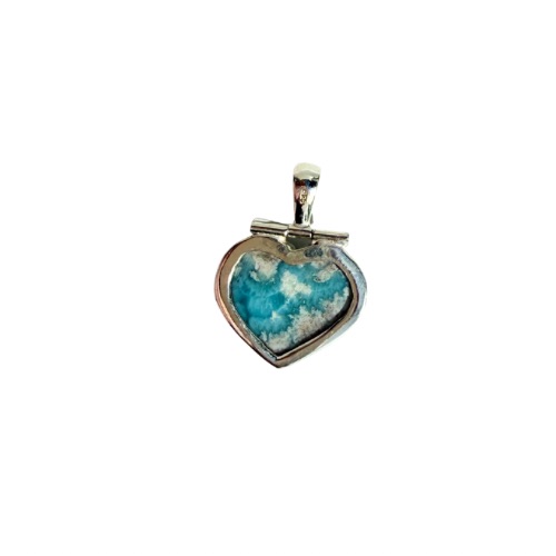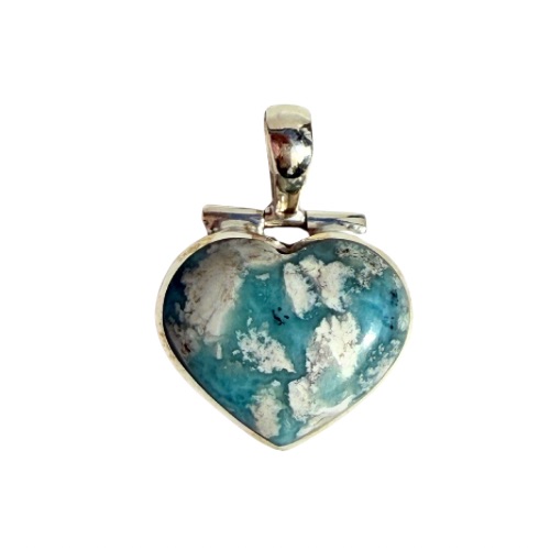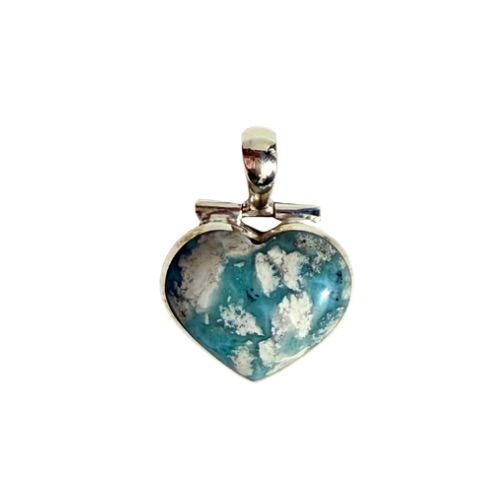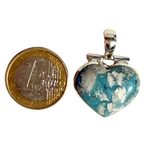 Ein Larimar-Herz als Anhänger, dessen einzigartige Musterung an das blaue Meer erinnert, das kleine sandfarbene Inseln umschließt. Die harmonische Farbkombination aus sanften Blau- und warmen Sandtönen verleiht dem Schmuckstück eine besondere Ausstrahlung. Eingefasst in Silber und mit einer beweglichen Aufhängung versehen, wirkt der Anhänger elegant und lebendig zugleich. Die offen gearbeitete Rückseite lässt den Stein direkt auf der Haut liegen, sodass seine Energie frei wirken kann – für Ruhe, Frieden und innere Ausgeglichenheit.