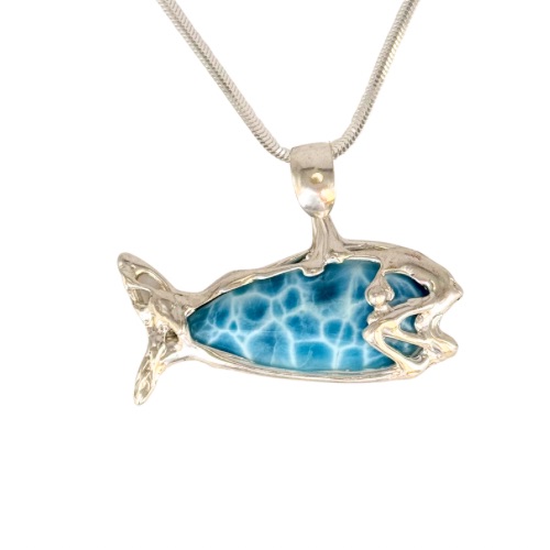 Inspiriert von unserer Liebe zum Meer präsentieren wir Ihnen den Anhänger Ben in AAA Qualität. In Form eines Fisches, raffiniert in Silber eingefasst, ist der Anhänger ein einzigartiges Schmuckstück, das die Schönheit des Meeres symbolisiert. Die wasserähnlichen Blautöne und Muster des Larimars wirken wie kleine, lebendige Ozeanszenen, perfekt passend zum Fischdesign. Durch die offene Rückseite kann der Stein direkt auf der Haut getragen werden und seine energetische Wirkung voll entfalten. Dieser Anhänger strahlt Lebensfreude und Kreativität aus und stärkt das Selbstvertrauen seines Trägers. Ob an einem eleganten Silberreif oder einem lässigen Lederband getragen, er fügt sich in jeden Stil ein. Ein inspirierendes und symbolträchtiges Geschenk, das das Meer und seine kraftvolle Energie stets bei sich trägt – perfekt für Liebhaber des Ozeans und solche, die nach etwas Einzigartigem suchen.