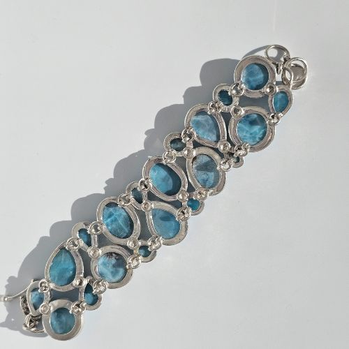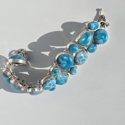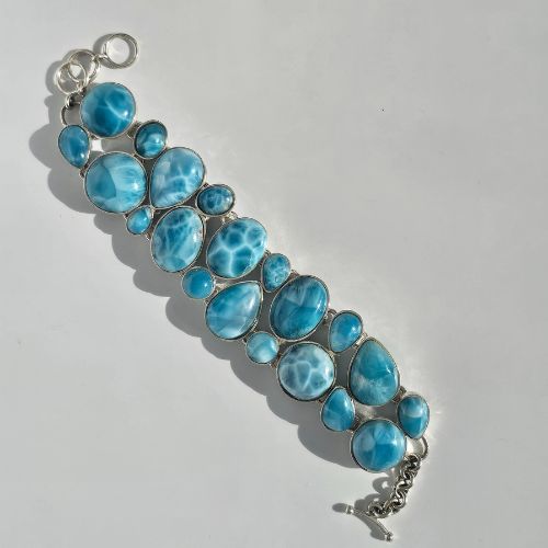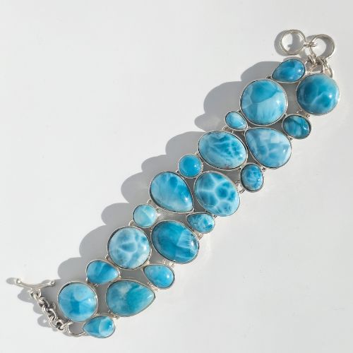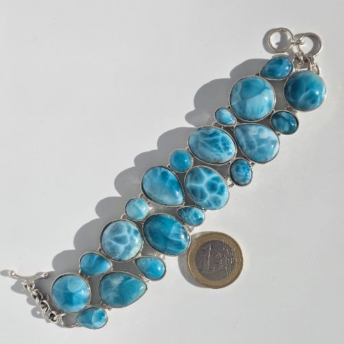 Seien Sie mutig und einzigartig mit dem exquisiten Rosali Armband in bester Larimar Qualität. Dieses auffällige Larimar-Armband vereint Luxus und Eleganz in perfekter Harmonie. Mit 20 handverlesenen Larimar-Steinen, die in unterschiedlichen Formen wie oval, rund und tropfenförmig  harmonisch zusammengesetzt sind, besticht es durch seine traumhaften Blautöne. Das Azurblau des Larimars, durchzogen von weißer Maserung, erinnert an die schäumende Gischt des Meeres oder an den Himmel mit weichen Wolken. Die feinen, beweglichen Silberglieder auf der Rückseite sorgen dafür, dass sich das Armband sanft ans Handgelenk schmiegt, während die offene Rückseite den freien Fluss der natürlichen Energie des Larimars ermöglicht. Dieses einzigartige Schmuckstück hebt sich durch seine exquisite Verarbeitung und Qualität hervor und ist ein absolutes „WOW“-Stück für besondere Anlässe. Ein luxuriöses Accessoire, das sofort ins Auge fällt und Eleganz mit einem Hauch von Abenteuer verbindet. Ein weiterer Pluspunkt ist die praktische Verlängerung , die es ermöglicht, die Passform individuell anzupassen. Die Verlängerung ist dezent in die beweglichen Silberglieder integriert, sodass der luxeriöse und harmonische Look des Armbandes erhalten bleibt.