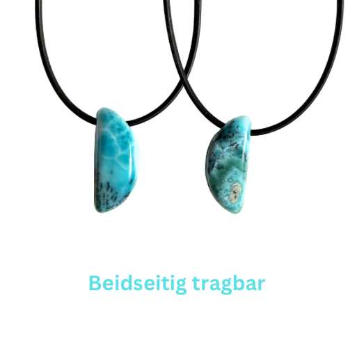 Saja: Dieser mondförmige Anhänger aus Larimar trägt die stille Kraft des Meeres in sich. Sein beruhigender Blauton erinnert an sanfte Wellen und offenen Horizont. Auf einer Seite durchziehen feine dunkle Striche den Stein – wie ein Schwarm kleiner Fische, der sich intuitiv und harmonisch bewegt. Sie stehen für den natürlichen Fluss des Lebens und die leise Weisheit, der eigenen inneren Richtung zu vertrauen. Die Rückseite zeigt ein anderes, freieres Muster: kleine Inselpunkte im Blau, wie ruhige Kraftorte im weiten Ozean. Sie symbolisieren Rückzug, Schutz und das Wissen, dass es selbst in bewegten Zeiten Orte der inneren Stabilität gibt.