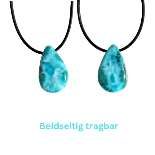 Zwei Seiten, zwei Stimmungen: Jede Seite zeigt eine eigene, faszinierende Musterung mit unterschiedlichen Blautönen – von weißlich-hellem Larimarblau bis hin zu grünblau schimmernden Nuancen. Und doch bleibt er unverkennbar larimartypisch. Wie ein Blick aufs Meer mit seinen geheimnisvollen Untiefen strahlt dieser Anhänger Ruhe, Frieden und tiefe Gelassenheit aus. Ein besonderes Schmuckstück, das begleitet, ausgleicht und die Weite des Ozeans spürbar macht.